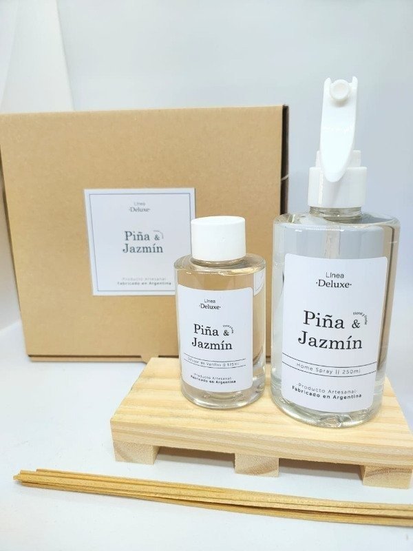 EL BOX INCLUYE: 1 difusor de 125cc con sus varillas + 1 home spray de 250cc + tarima de madera (todo dentro de una caja de carton con viruta)