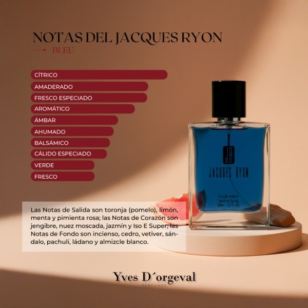 Pomelo, Limón, Menta, Pimienta Rosa, Jengibre, Nuez Moscada, Jazmín, Ámbar, Cedro, Sándalo, Pachulí.