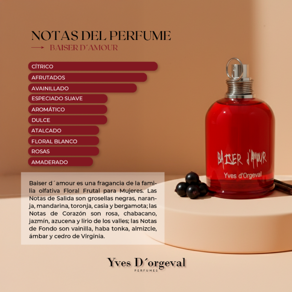 Las Notas de Salida son grosella negra, naranja, mandarina, pomelo, casia y bergamota; las Notas de Corazón son rosa, albaricoque, jazmín, azucena y lirio de los valles; las Notas de Fondo son vainilla, haba tonka, almizcle, ámbar y cedro de Virginia.