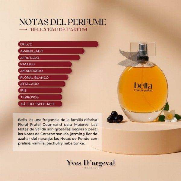 Las Notas de Salida son Grosella Negra y Pera; las Notas de Corazón son iris, jazmín y azahar; las Notas de Fondo son praliné, vainilla, pachulí y haba tonka