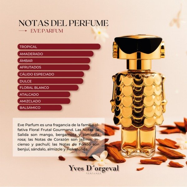 Las Notas de Salida son mango, pimienta rosa y bergamota; las Notas de Corazón son jazmín, pachulí y Incienso; las Notas de Fondo son sándalo, benjuí y almizcle. 70 ml