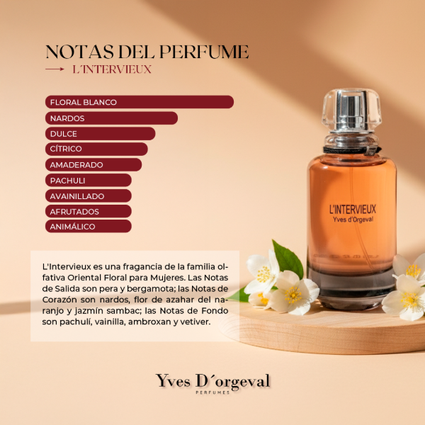 Las Notas de Salida son pera y bergamota; las Notas de Corazón son nardosos, azahar y jazmín sambac; las Notas de Fondo son pachulí, vainilla, ambroxano y vetiver.