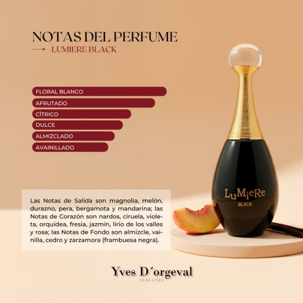 Las Notas de Salida son magnolia, melón, durazno (melocotón), pera, bergamota y mandarina; las Notas de Corazón son nardos, ciruela, violeta, orquídea, fresia, jazmín, lirio de los valles (muguete) y rosa; las Notas de Fondo son almizcle, vainilla, cedro y zarzamora (frambuesa negra).