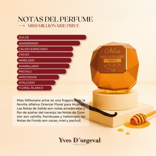 Las Notas de Salida son notas amaderadas y flor de naranja; las Notas de Corazón son vainilla, frambuesa y heliotropo; las Notas de Fondo son cacao, miel y pachulí.