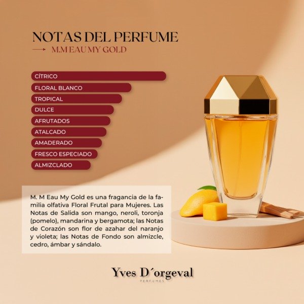 Las Notas de Salida son mango, neroli, pomelo, mandarina y bergamota; las Notas de Corazón son azahar y violeta; las Notas de Fondo son almizcle, cedro, ámbar y sándalo.