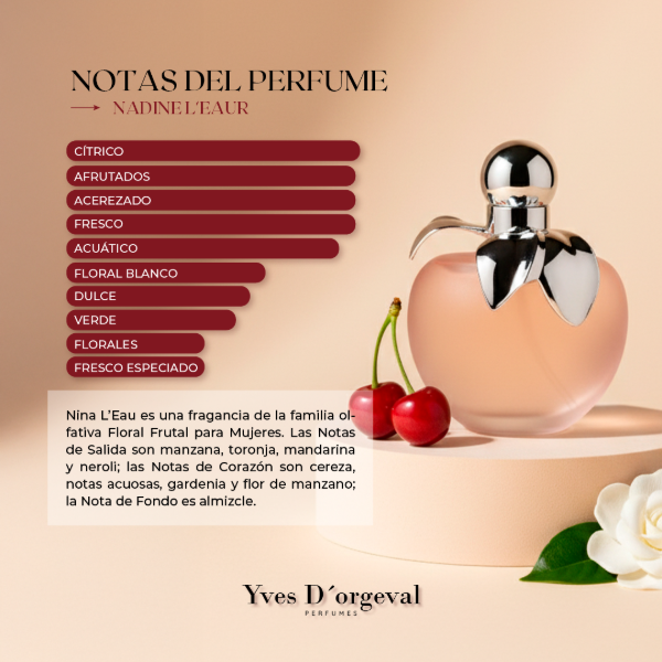 Las Notas de Salida son manzana, pomelo, mandarina y neroli; las Notas de Corazón son cereza, notas acuosas, gardenia y flor de manzano; la Nota de Fondo es Almizcle.