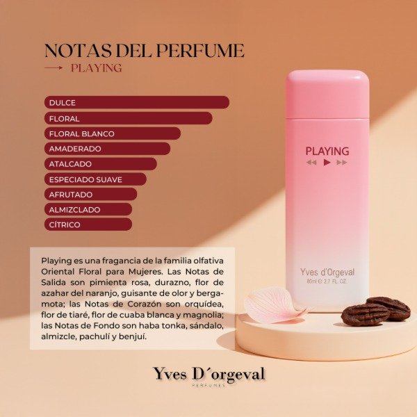 Las Notas de Salida son pimienta rosa, melocotón, azahar, guisante dulce y bergamota; las Notas de Corazón son orquídea, flor de tiaré, amyris y magnolia; las Notas de Fondo son sándalo, haba tonka, pachulí, benjuí y almizcle.