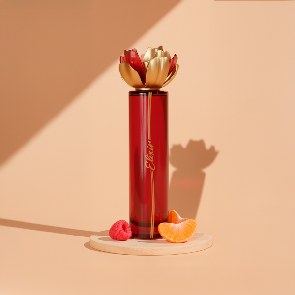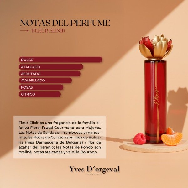 Las Notas de Salida son frambuesa y mandarina; las Notas de Corazón son Rosa de Bulgaria y Azahar; las Notas de Fondo son praliné, vainilla Bourbon y notas en polvo.