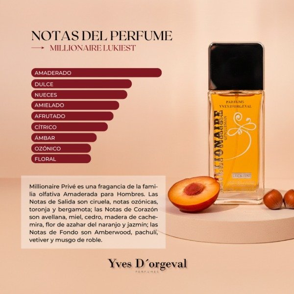 Las Notas de Salida son ciruela, notas ozónicas, toronja (pomelo) y bergamota; las Notas de Corazón son avellana, miel, cedro, madera de cachemira, jazmín y flor de azahar del naranjo; las Notas de Fondo son Amberwood, pachulí, musgo de roble y vetiver.