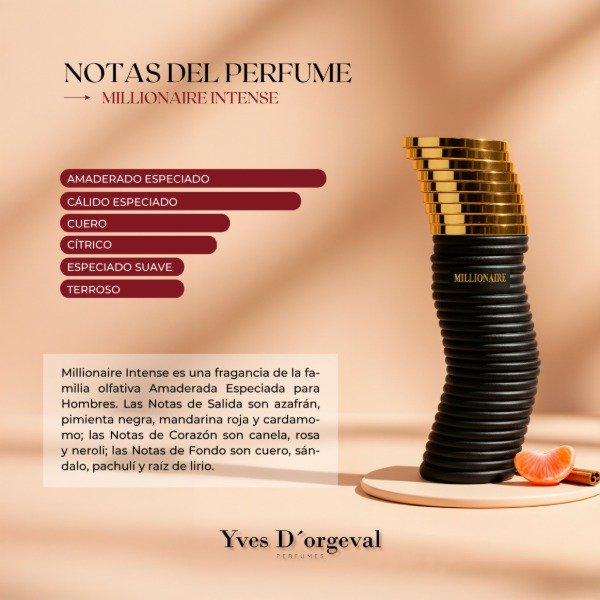Las Notas de Salida son azafrán, pimienta negra, mandarina roja y cardamomo; las Notas de Corazón son canela, rosa y neroli; las Notas de Fondo son cuero, sándalo, pachulí y raíz de lirio.