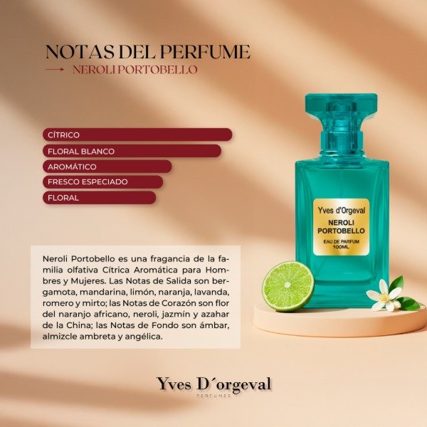 Las Notas de Salida son bergamota, mandarina, limón (lima ácida), naranja amarga, lavanda, romero y mirto; las Notas de Corazón son flor del naranjo africano, neroli, jazmín y azahar de la China; las Notas de Fondo son ámbar, angélica y almizcle ambreta.
